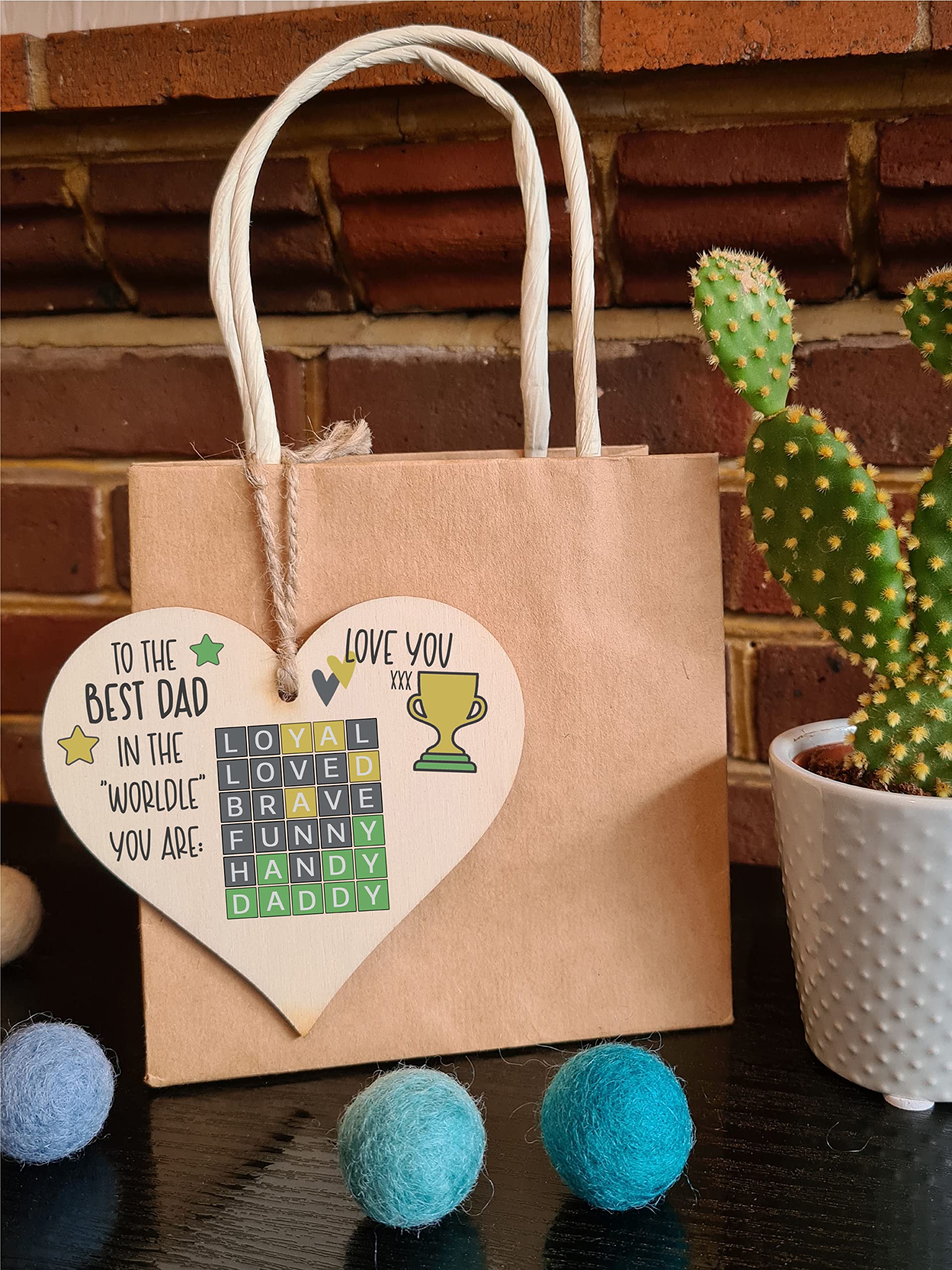 A beautifully designed, heart shaped plaque, handmade in the UK from sustainably sourced 3mm poplar wood. Size: 10 x 10 cm. Wording on hanging plaque: To the Best Dad In the "Worldle" You Are: Loyal Loved Brave Funny Handy Daddy Love You xxx. The design is totally unique and the print is applied directly onto the heart making it extremely vibrant and durable. All design, manufacture and packaging is done by a small team based in the UK. The heart is packaged in a transparent sleeve, and comes with a length of shabby chic twine, making it perfect to give as a gift. Ideal for use as tags on presents and gift bags, or you could hang it around the neck of a bottle. These are an ideal alternative to a traditional greetings card. The wording is just perfect to show your Dad just how important he is. Celebrate your special relationship with a fun, unique gift. This hanging heart is great as a 'just because' gift for someone special, be it friends, family, neighbours, colleagues or grandparents. Maybe even as a little treat for yourself.