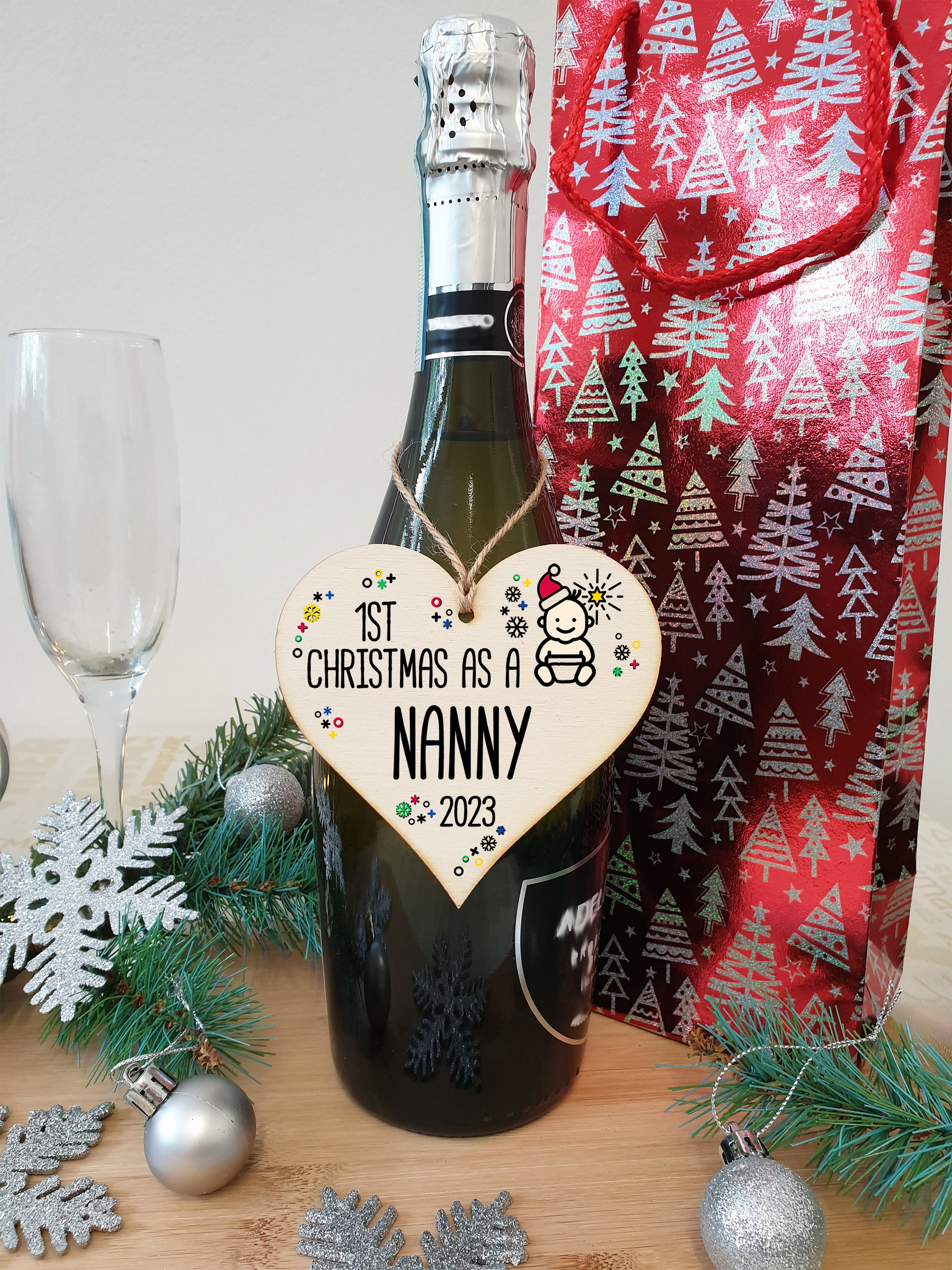 � Small gift that is a perfect alternative to a greetings card. Makes an ideal Secret Santa present. � Hang on the tree, slip into a card, use as a gift tag on a present, or round the neck of a bottle. � Packaged in a transparent sleeve. Size: Approx. 9 x 9 cm. Includes a length of hessian twine for hanging � Made from high quality sustainable 3mm Plywood (PEFC Certified)Wording on plaque decoration: 2022 1st Christmas as a Nanny These beautiful handcrafted heart shaped wooden Christmas plaques make a great little gift for someone special. The exclusive festive design will add style to any gift or tree, and the shabby chic effect is on trend. This could make an ideal Sercret Santa gift for colleagues at work. Ideal for use as tags on presents and gift bags. Hang around the neck of a bottle of fizz at the Christmas dinner table. Perfect as a bauble or sign to hang on your Christmas tree for a unique and personal way to celebrate Christmas. Use as place settings, wrapped around the stem of a wine glass. Or wish someone a very Merry Christmas, just because! **Please note colours may vary on product due to materials used and hand-made nature of the product.