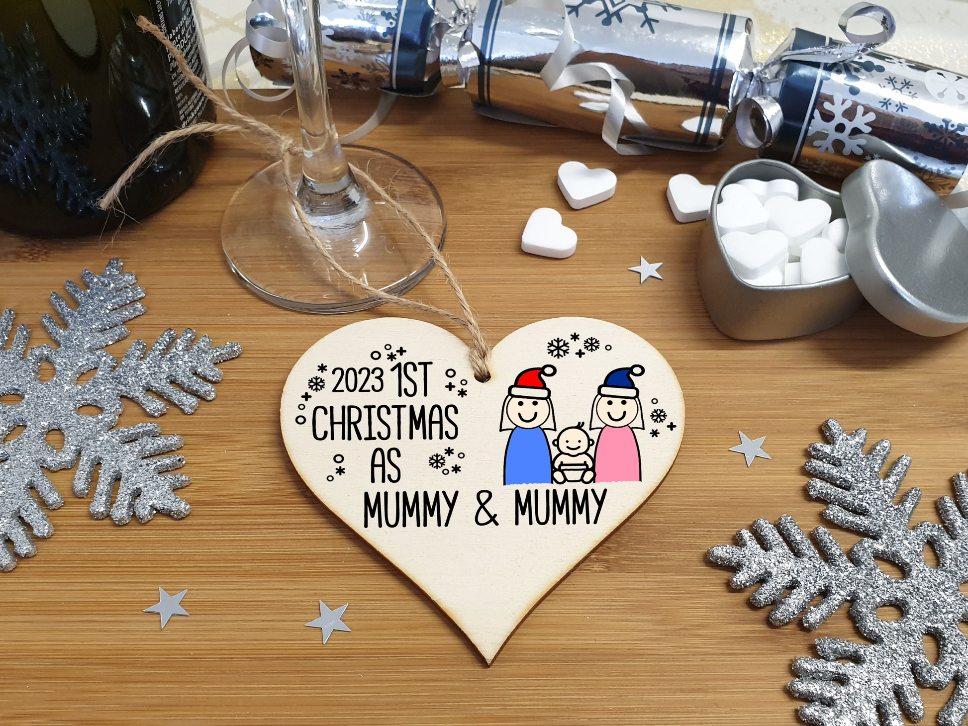 � Small gift that is a perfect alternative to a greetings card. Makes an ideal Secret Santa present. � Hang on the tree, slip into a card, use as a gift tag on a present, or round the neck of a bottle. � Packaged in a transparent sleeve. Size: Approx. 9 x 9 cm. Includes a length of hessian twine for hanging � Made from high quality sustainable 3mm Plywood (PEFC Certified)Wording on plaque decoration: 2022 1st Christmas as Mummy & Mummy These beautiful handcrafted heart shaped wooden Christmas plaques make a great little gift for someone special. The exclusive festive design will add style to any gift or tree, and the shabby chic effect is on trend. This could make an ideal Sercret Santa gift for colleagues at work. Ideal for use as tags on presents and gift bags. Hang around the neck of a bottle of fizz at the Christmas dinner table. Perfect as a bauble or sign to hang on your Christmas tree for a unique and personal way to celebrate Christmas. Use as place settings, wrapped around the stem of a wine glass. Or wish someone a very Merry Christmas, just because! **Please note colours may vary on product due to materials used and hand-made nature of the product.