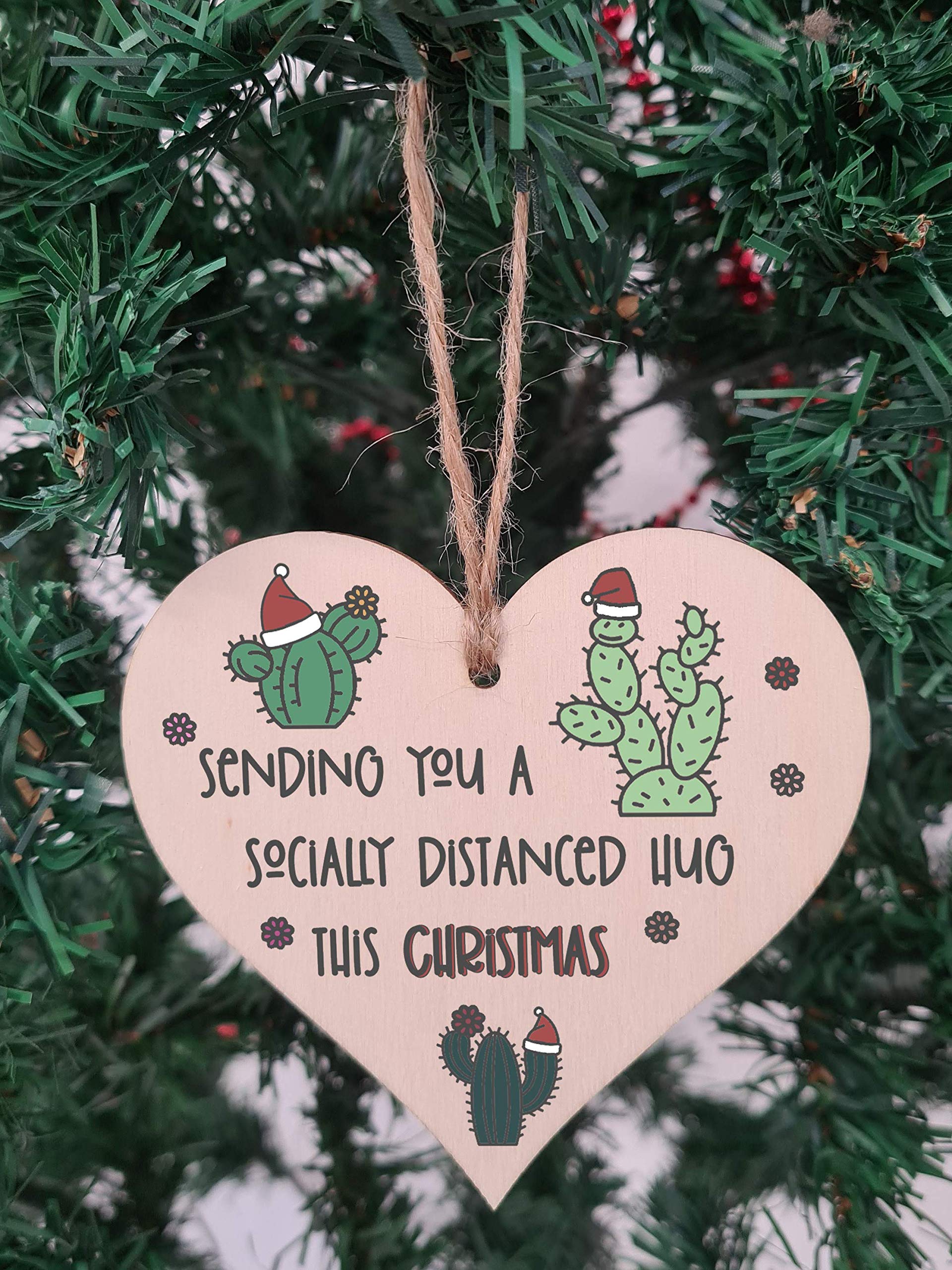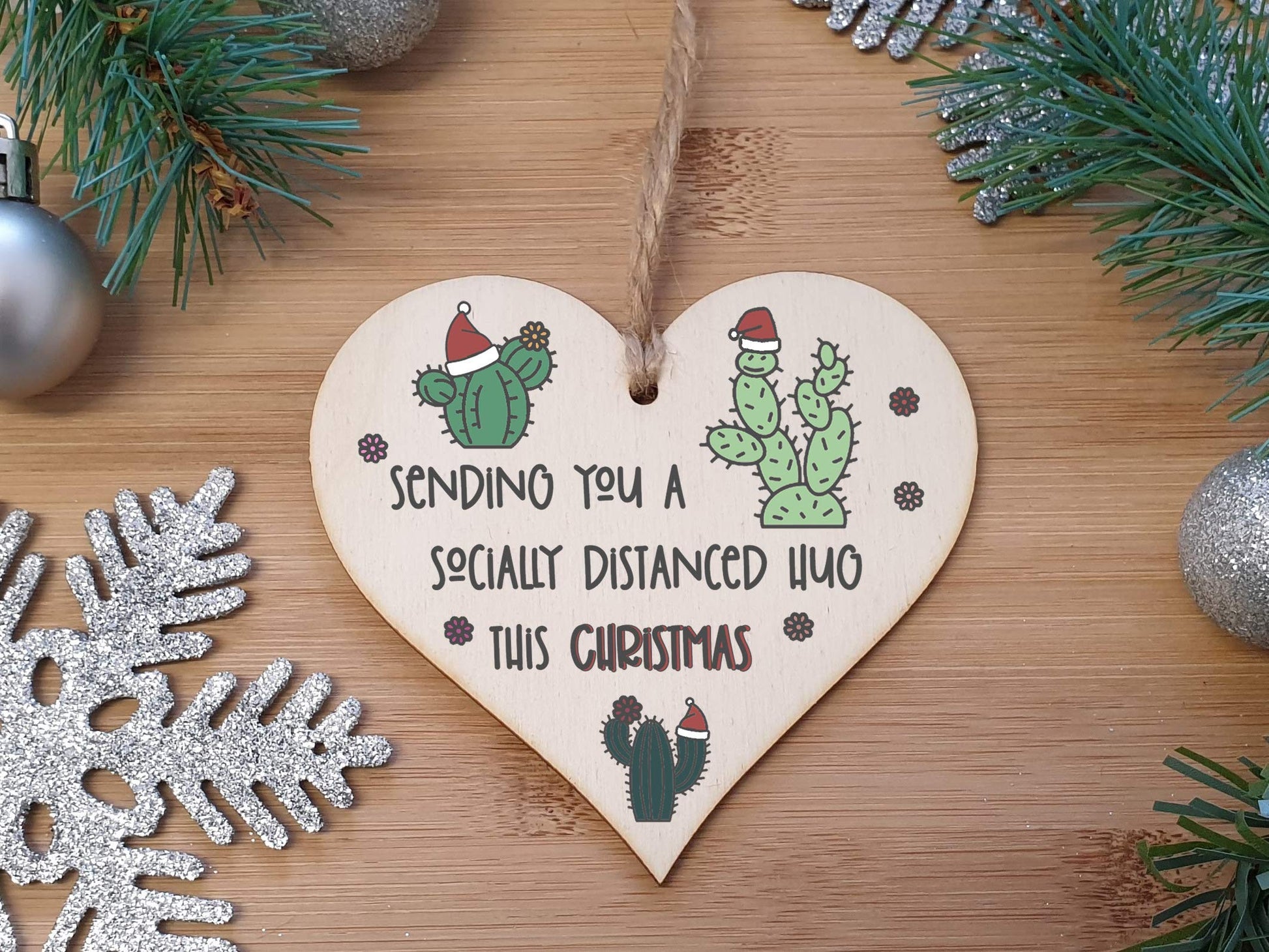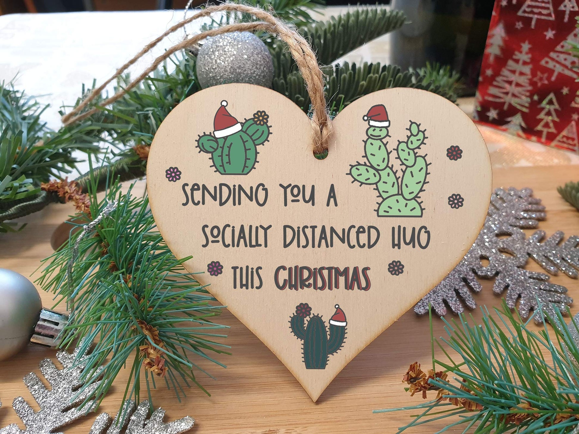 Handmade Wooden Hanging Heart Plaque Christmas Tree Bauble Socially Distance Hug Cactus Funny Card Alternative Long Distance Family Friends