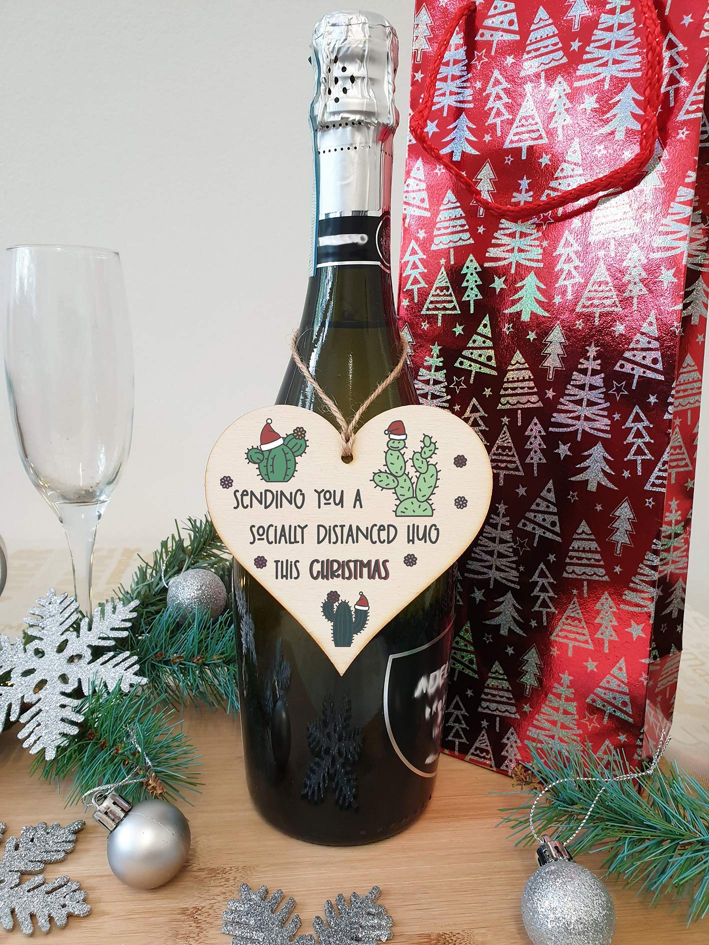 A beautifully designed, handmade heart shaped plaque or tree bauble, made from 3mm poplar wood. Size: 10 x 10 cm Wording on hanging plaque: Sending you a socially distanced hug this Christmas These beautiful handcrafted heart shaped wooden Christmas plaques make a great little gift for someone special. The heart is packaged in a transparent sleeve, and comes with a length of shabby chic twine. The print is applied directly onto the heart and is extremely durable and vibrant. The exclusive festive design will add style to any gift or tree, and the shabby chic effect is on trend. Ideal for use as tags on presents and gift bags. Hang around the neck of a bottle of fizz at the Christmas dinner table. The wording is just perfect to show the special people in your life just how important they are, or how much you are missing them. It is a novelty and fun way to send Christmas wishes to those special people you won't be able to see this festive season. Whether for friends, neighbours, grandparents and colleagues, these fit perfectly inside an envelope for posting.