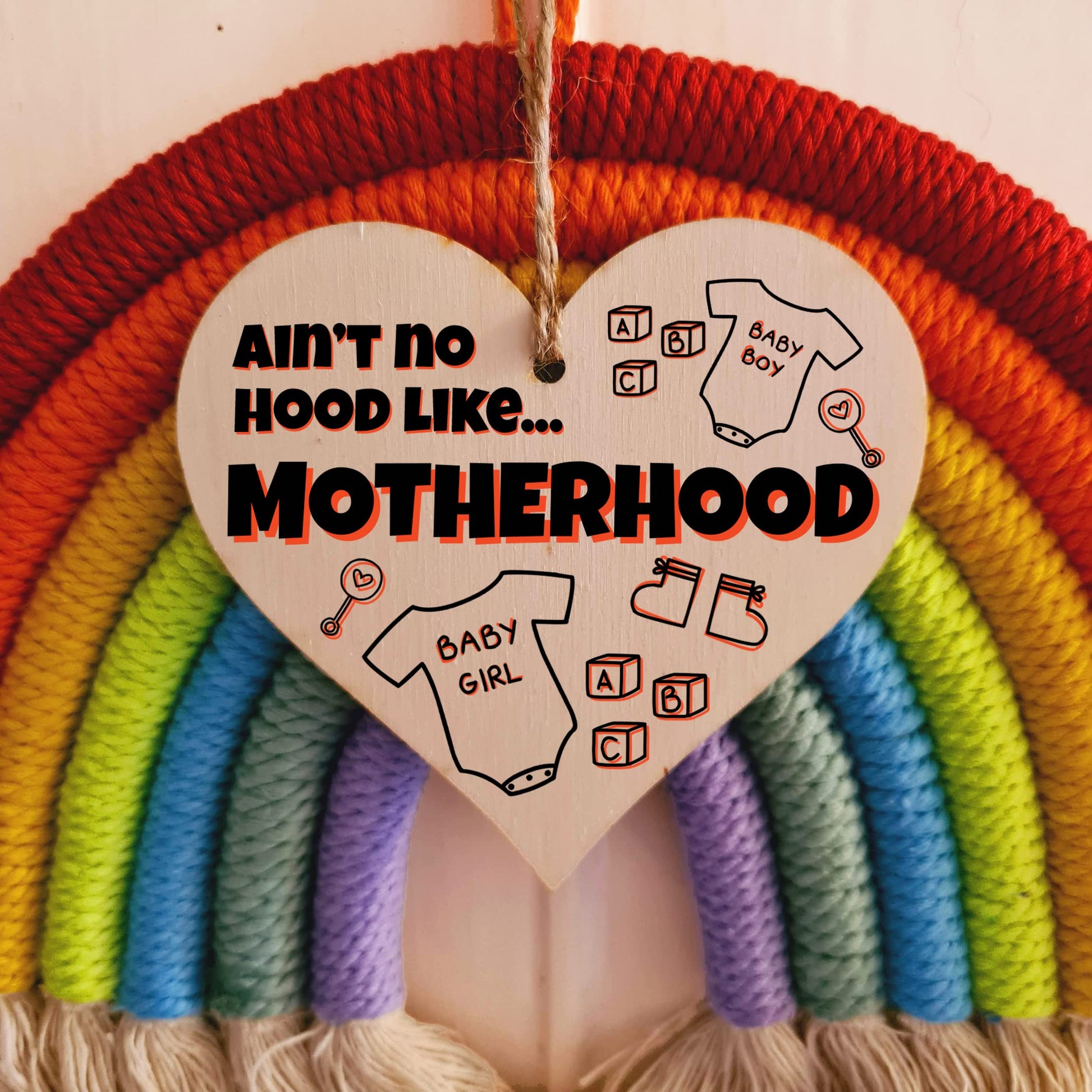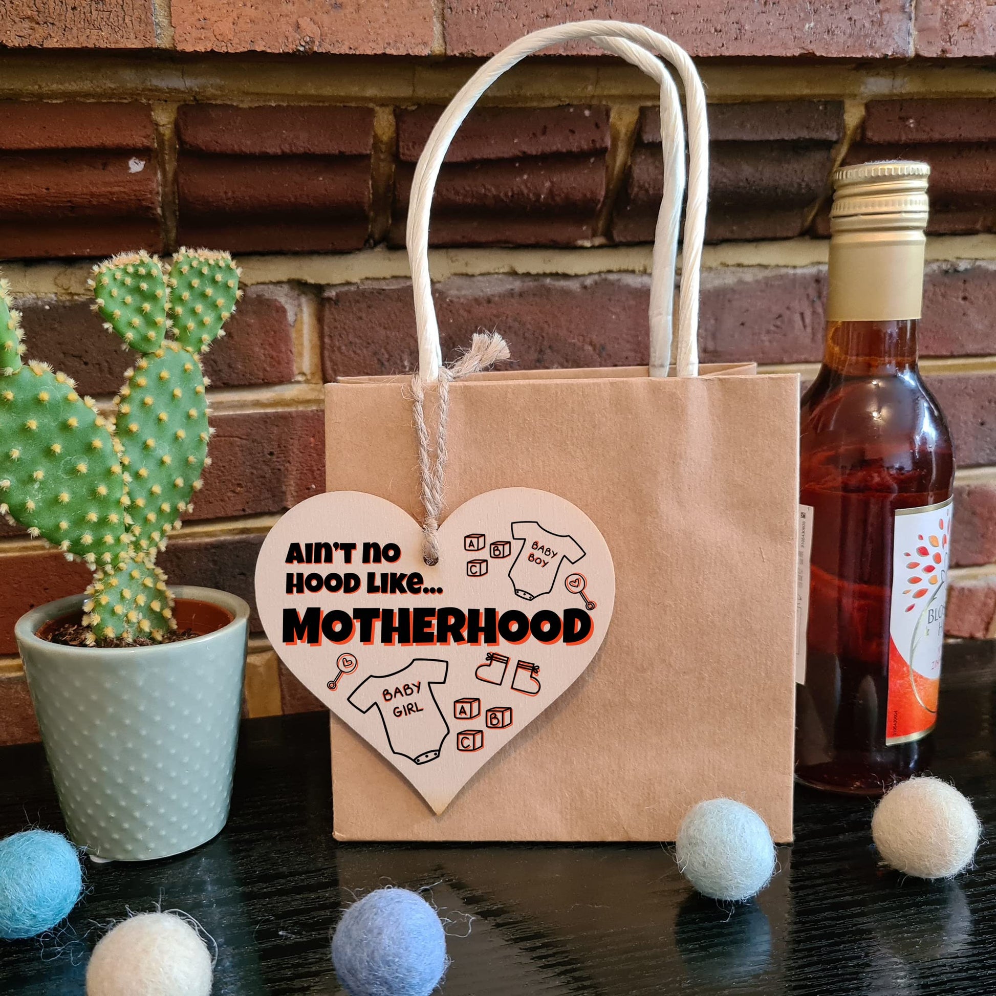 Beautiful handmade wooden heart shaped plaque. Shabby chic style hanging sign, with a unique printed design. Ideal gift for someone special. Made from high quality sustainable 3mm Plywood (Programme for the Endorsement of Forest Certification). Can be used as a hanging decoration, or even as a gift tag. Tag Reads Ain't no hood like motherhood