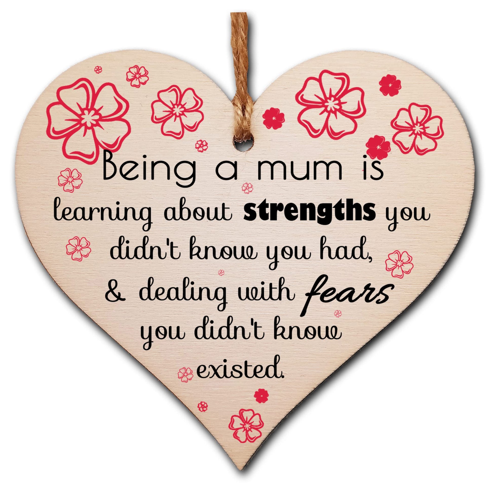 Beautiful handmade wooden heart shaped plaque. Shabby chic style hanging sign, with a unique printed design. Ideal gift for someone special. Made from high quality sustainable 3mm Plywood (Programme for the Endorsement of Forest Certification). Can be used as a hanging decoration, or even as a gift tag. Tag Reads Being a mum is learning about strengths you didn't know you had, and dealing with fears you didn't know existed.
