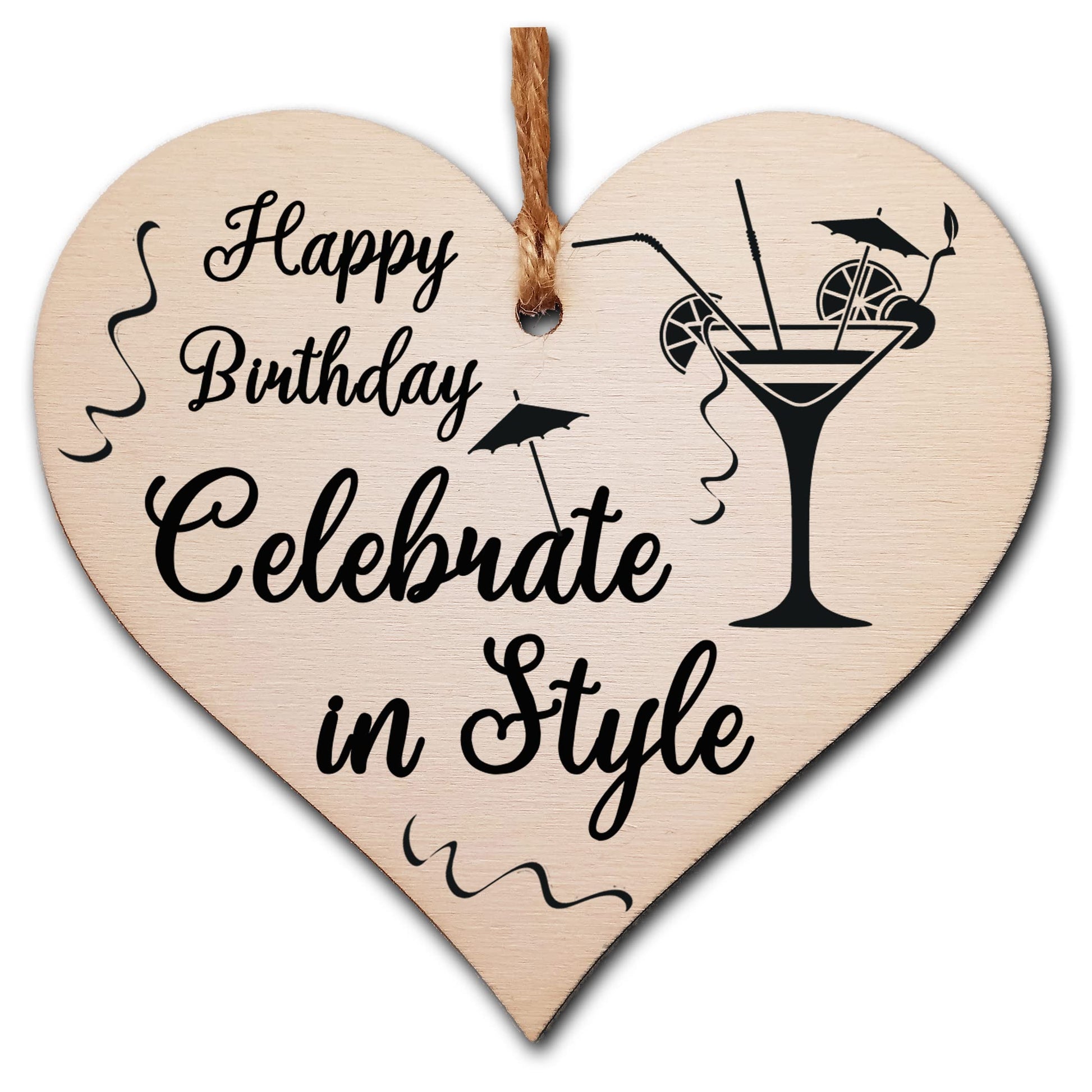 Beautiful handmade wooden heart shaped plaque. Shabby chic style hanging sign, with a unique printed design. Ideal gift for someone special. Made from high quality sustainable 3mm Plywood (Programme for the Endorsement of Forest Certification). Can be used as a hanging decoration, or even as a gift tag. Tag Reads Happy Birthday. Celebrate in Style