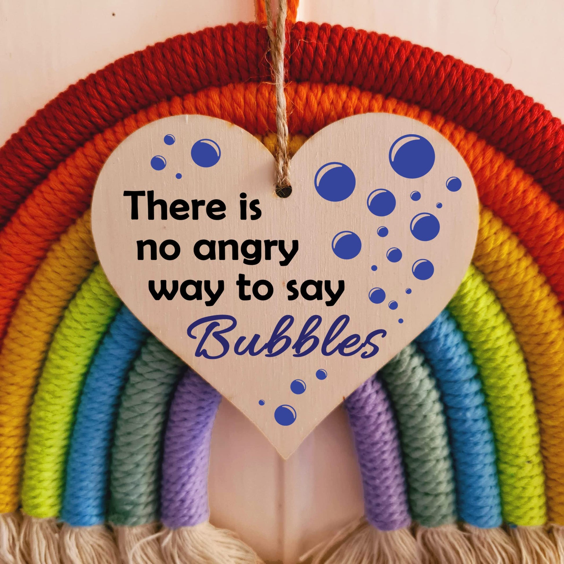 Beautiful handmade wooden heart shaped plaque. Shabby chic style hanging sign, with a unique printed design. Ideal gift for someone special. Made from high quality sustainable 3mm Plywood (Programme for the Endorsement of Forest Certification). Can be used as a hanging decoration, or even as a gift tag. Tag Reads There is no angry way to say bubbles