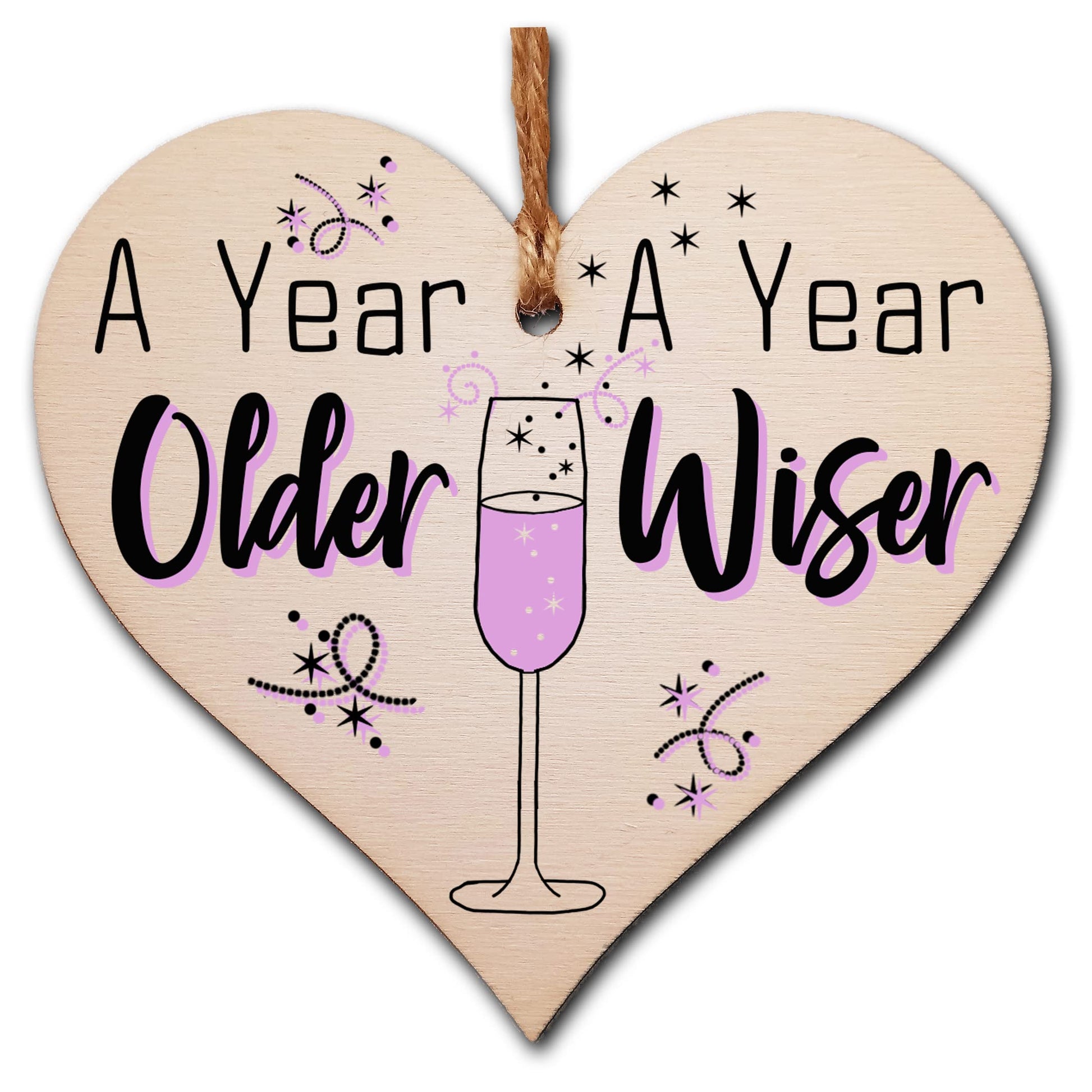 Beautiful handmade wooden heart shaped plaque. Shabby chic style hanging sign, with a unique printed design. Ideal gift for someone special. Made from high quality sustainable 3mm Plywood (Programme for the Endorsement of Forest Certification). Can be used as a hanging decoration, or even as a gift tag. Tag Reads A Year Older - A Year Wiser