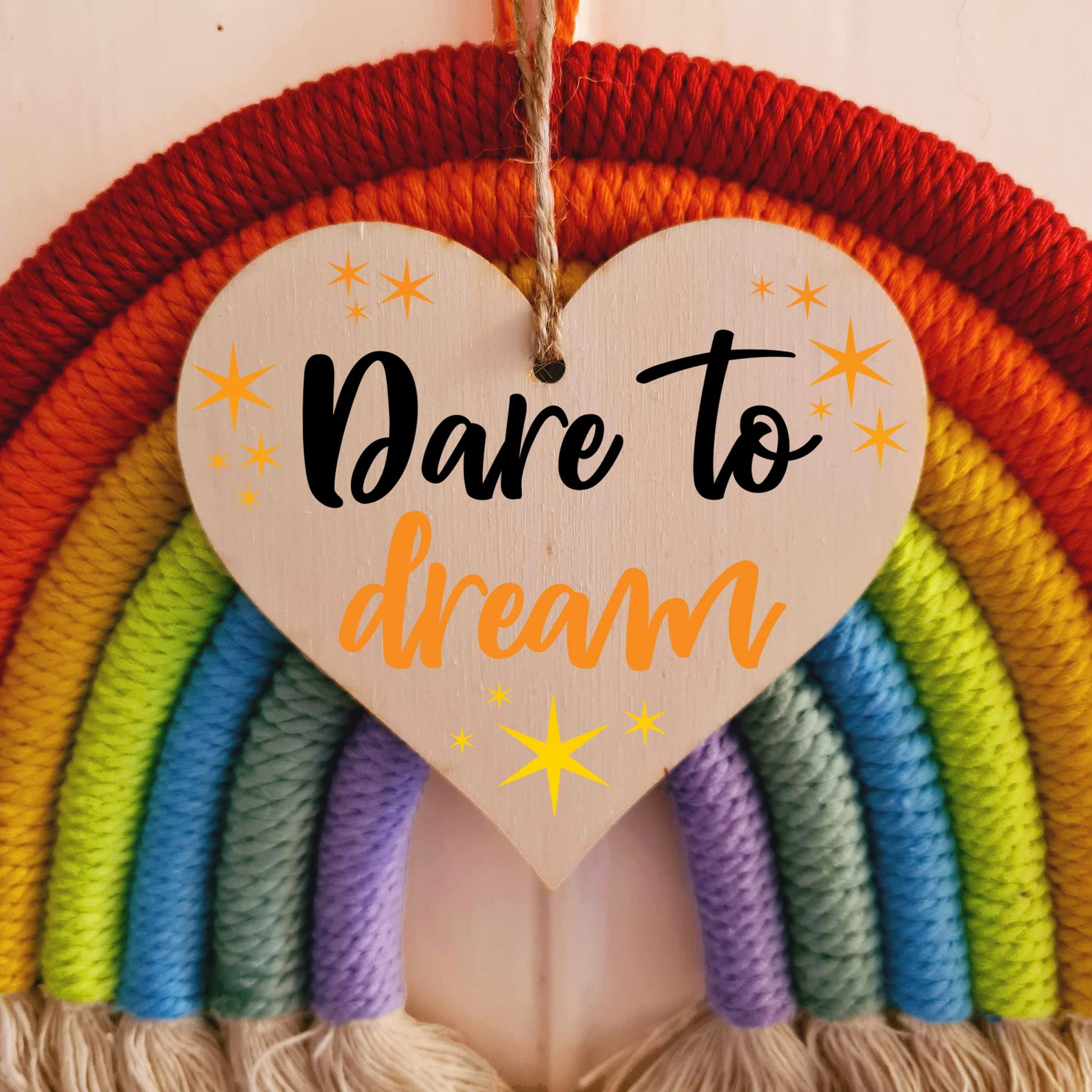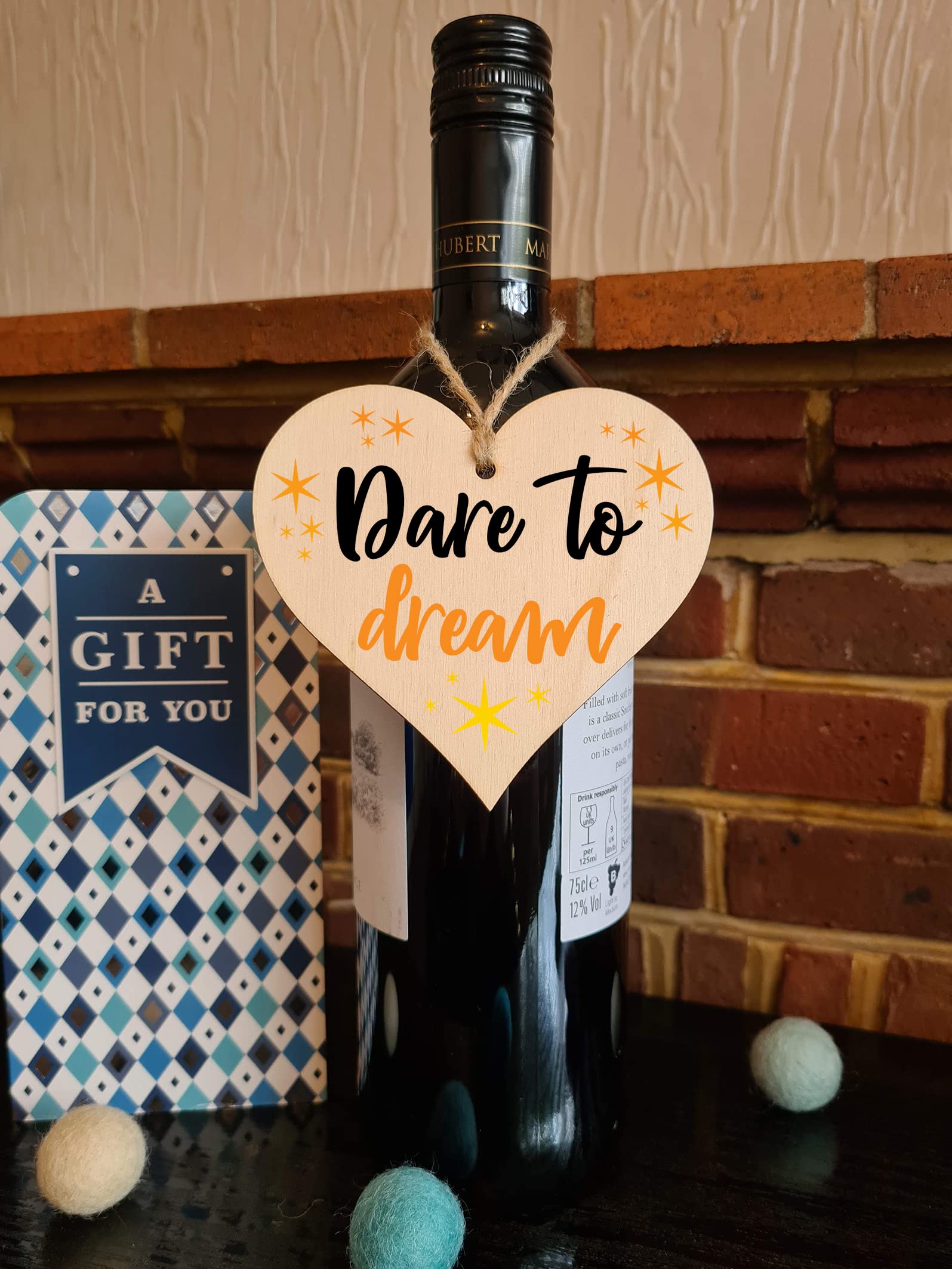 Beautiful handmade wooden heart shaped plaque. Shabby chic style hanging sign, with a unique printed design. Ideal gift for someone special. Made from high quality sustainable 3mm Plywood (Programme for the Endorsement of Forest Certification). Can be used as a hanging decoration, or even as a gift tag. Tag Reads Dare to dream