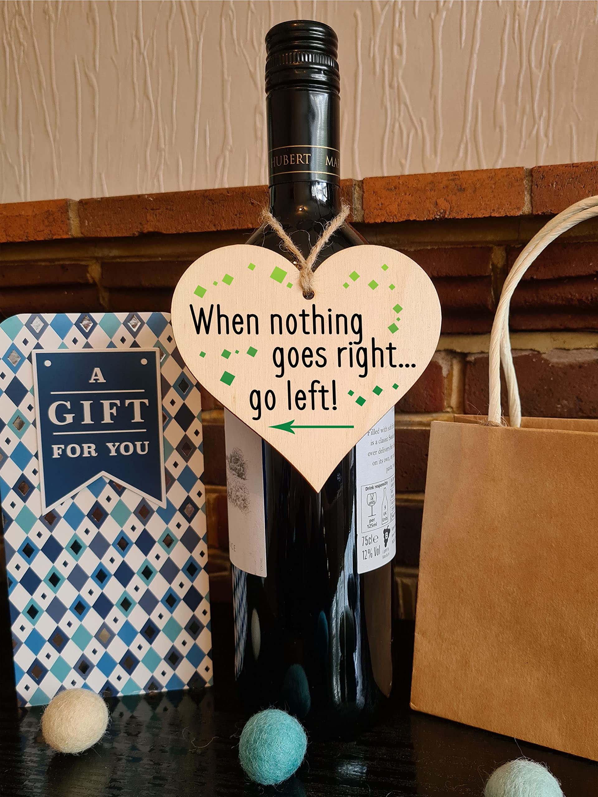 Beautiful handmade wooden heart shaped plaque. Shabby chic style hanging sign, with a unique printed design. Ideal gift for someone special. Made from high quality sustainable 3mm Plywood (Programme for the Endorsement of Forest Certification). Can be used as a hanging decoration, or even as a gift tag. Tag Reads When nothing goes right… go left