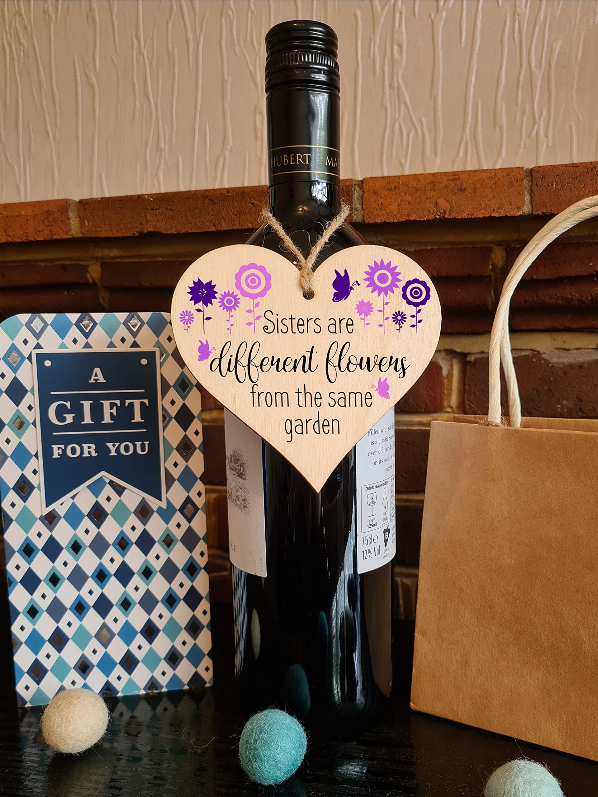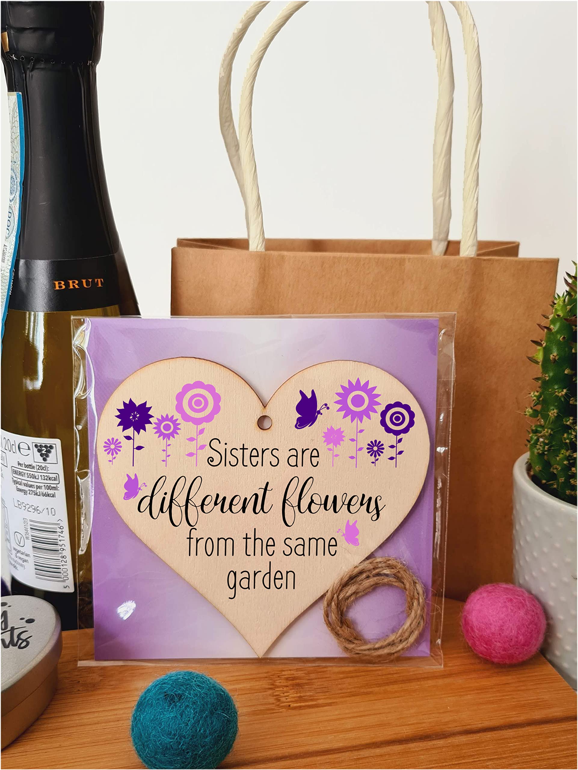 Beautiful handmade wooden heart shaped plaque. Shabby chic style hanging sign, with a unique printed design. Ideal gift for someone special. Made from high quality sustainable 3mm Plywood (Programme for the Endorsement of Forest Certification). Can be used as a hanging decoration, or even as a gift tag. Tag Reads Sisters are different flowers from the same garden