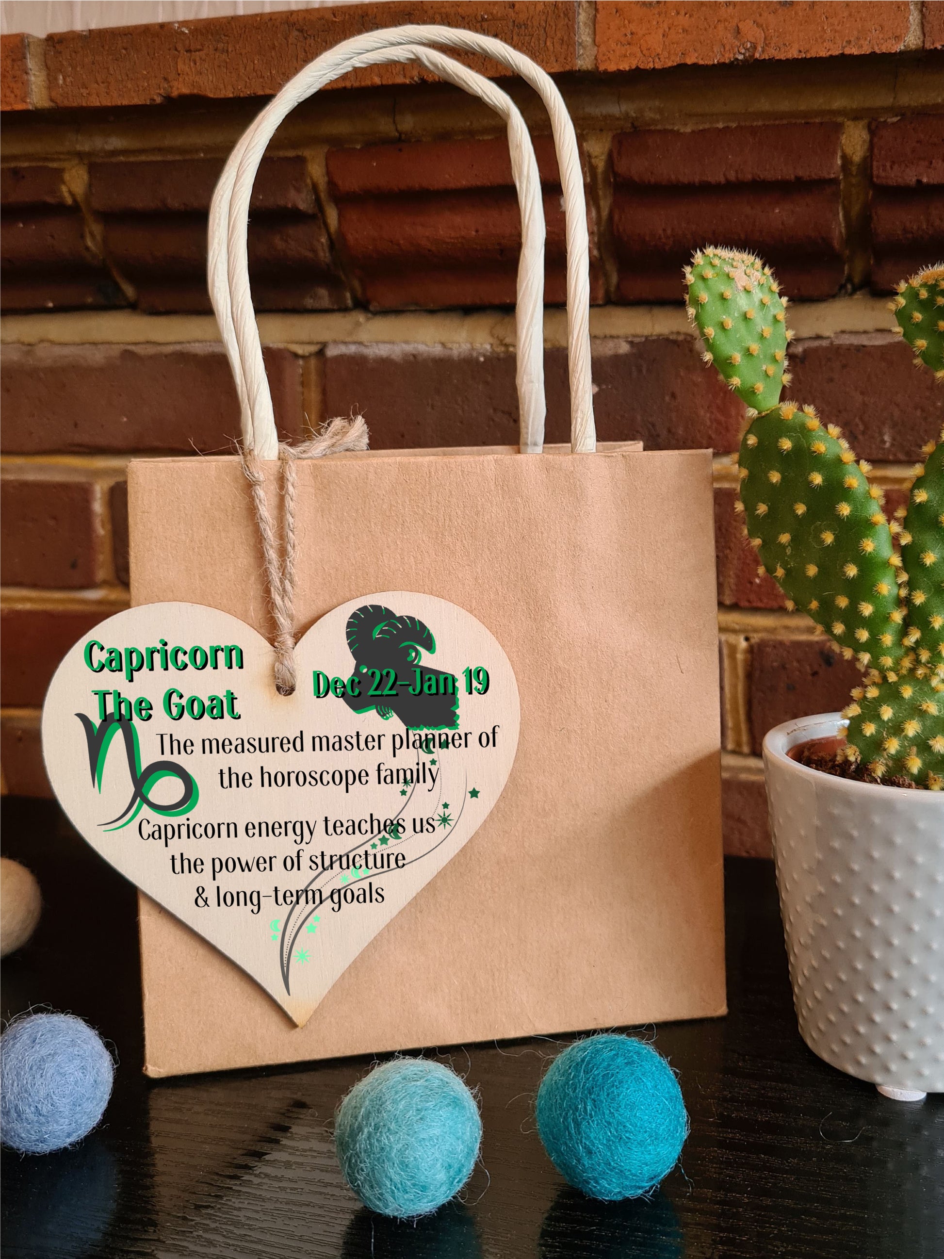 Handmade Wooden Hanging Heart Plaque Gift Signs of the Zodiac Capricorn Astrological Star Sign Keepsake Card Alternative