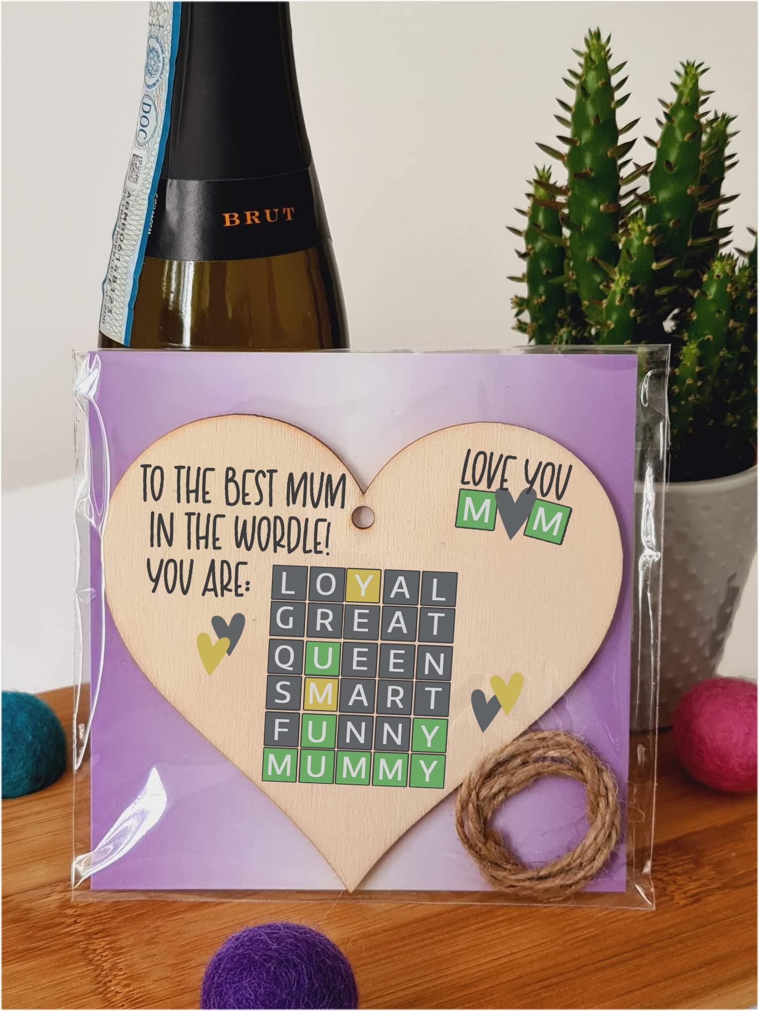 A wooden heart shaped plaque, handmade in the UK from sustainably sourced 3mm poplar wood. Size: 10 x 10 cm. Wording on the plaque: To the best Mum in the WORDLE! You are: LOYAL GREAT QUEEN SMART FUNNY MUMMY LOVE YOU MUM. This heart shaped plaque is the perfect present for the wordle fan in your life. A great gift, which is a fun, novelty take on the word game craze that has swept the world in recent months and if you haven't played it, then you'll know someone who has. It would be an ideal mother's day card alternative with a sweet, fun message about how amazing your mum is. The print is applied directly onto the heart making it extremely vibrant and durable. All design, manufacture and packaging is done by a small team based in the UK. The heart is packaged in a transparent sleeve, and comes with a length of shabby chic twine, making it perfect to give as a gift or as an alternative to a traditional greetings card. Ideal for use as tags on presents and gift bags, or you could hang it around the neck of a bottle.