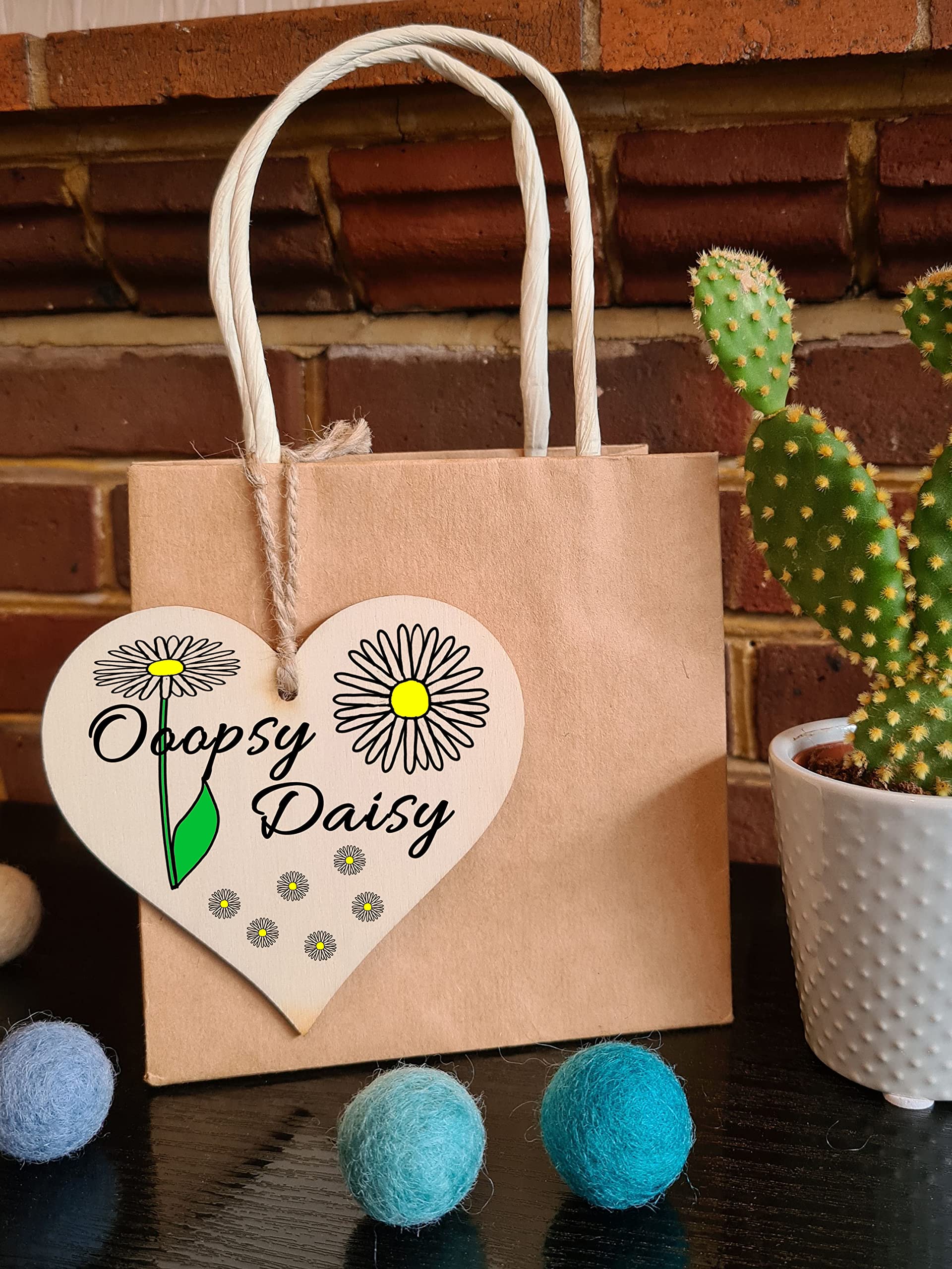 Beautiful handmade wooden heart shaped plaque. Shabby chic style hanging sign, with a unique printed design. Ideal gift for someone special. Made from high quality sustainable 3mm Plywood (Programme for the Endorsement of Forest Certification). Can be used as a hanging decoration, or even as a gift tag. Tag Reads Ooopsy Daisy