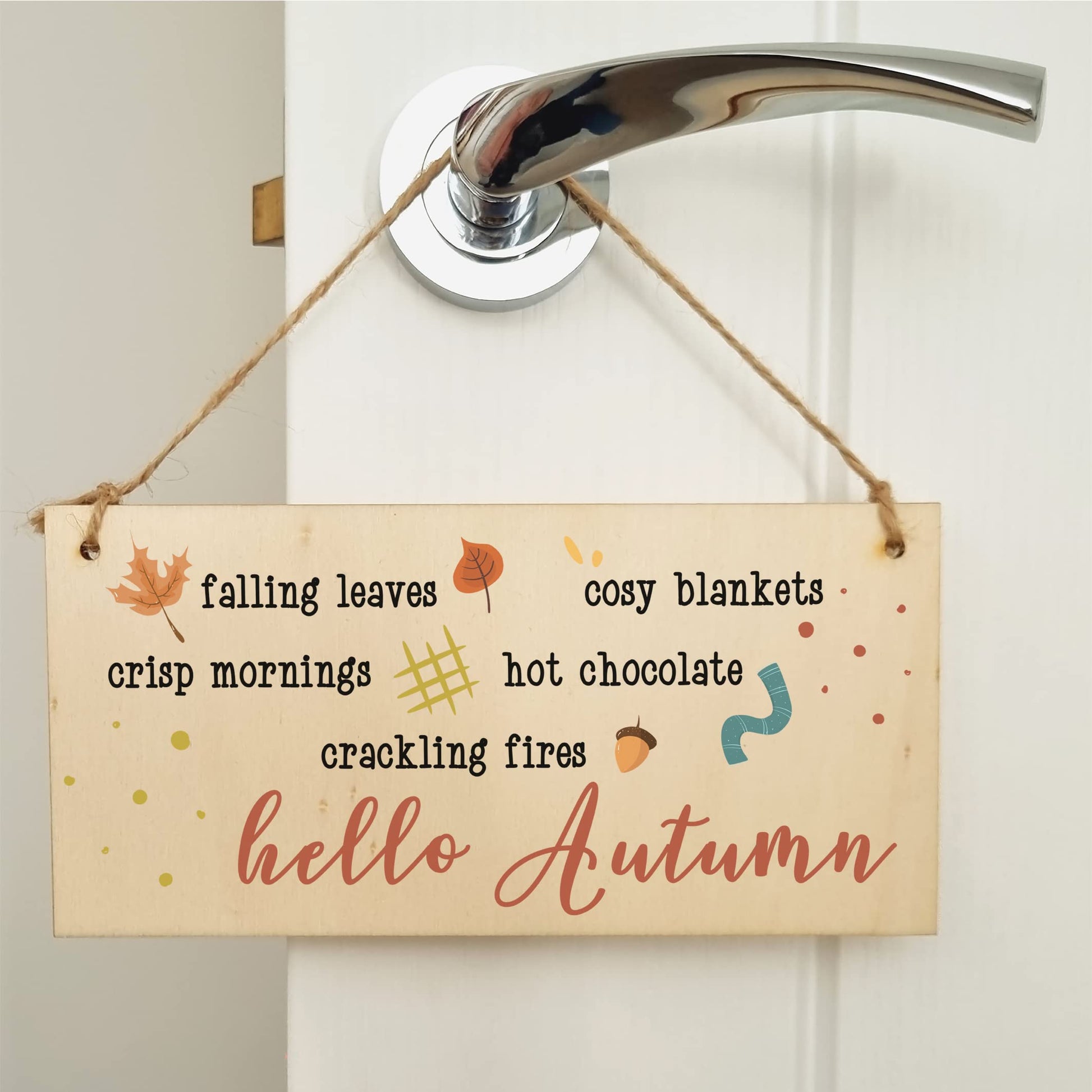 hello Autumn Seasonal Falling Leaves Cosy Decorative Sign Handmade Wooden Hanging Wall Plaque Gift Hallway Home Décor