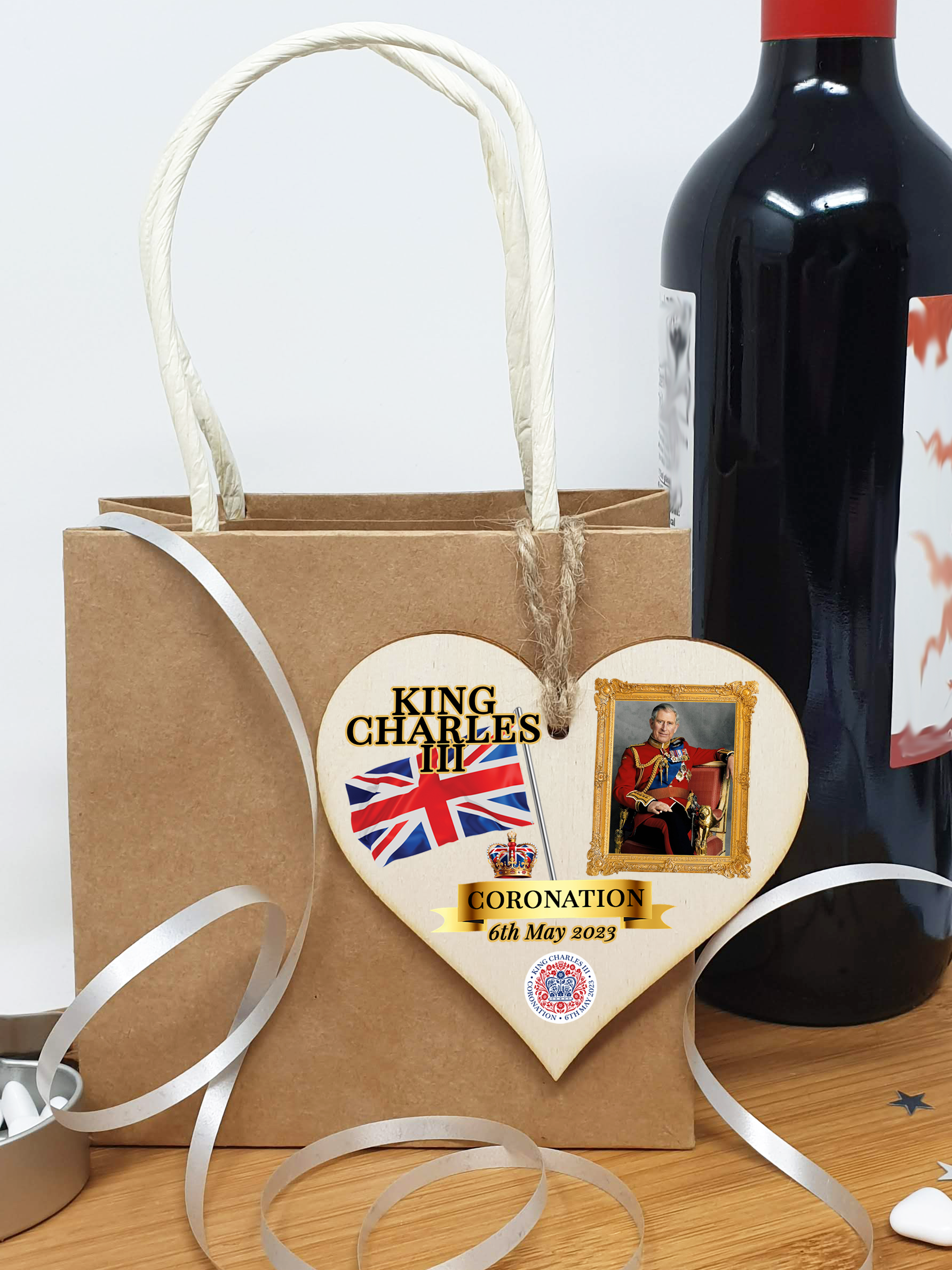 � {Commemorate the Coronation of King Charles III} A unique and decorative keepsake of our new king. Celebrate the coronation of His Majesty King Charles III with a wonderful piece of memorabilia. A great alternative to standard bunting, hang at your street party to enjoy the festivities on 6th May 2023. � {Beautiful Decoration} Featuring a photo of the new King, and the bright colours of the Union Jack flag, this decorative plaque can be hung throughout the home to commemorate the ascension to the throne of King Charles III. Give as a gift to family and friends. � {Materials & Size} Size: 100mm (W) x 100mm (L) x 3mm. We use sustainably sourced 3mm Plywood (PEFC Certified) from a family run forestry. Every plaque is packaged in a transparent sleeve, ready to gift, and with a length of rustic hessian jute string for hanging. � {Handmade in the UK} The plaque is handcrafted in Birmingham, UK, by a small team dedicated to creating high quality, affordable decorations. Every order is cut, printed and packaged with care and attention to ensure the product reaches you in perfect condition.A beautifully designed, heart shaped plaque, handmade in the UK from sustainably sourced 3mm poplar wood. Size: 10 x 10 cm. Wording on hanging plaque: King Charles III Coronation 6th May 2023. Commemorate the coronation of King Charles III on 6th May 2023 with this unique and decorative plaque. A great alternative to standard flag bunting, and with a photo of our new monarch. Show your patriotic support by hanging this decoration around the home. The design is totally unique and the print is applied directly onto the heart making it extremely vibrant and durable. All design, manufacture and packaging is done by a small team based in the UK. The heart is packaged in a transparent sleeve, and comes with a length of shabby chic twine, making it perfect to give as a gift. Ideal for use as tags on presents and gift bags, or you could hang it around the neck of a bottle. This hanging heart is great as a 'just because' gift for someone special, be it friends, family, neighbours, colleagues or grandparents. Maybe even as a little treat for yourself.