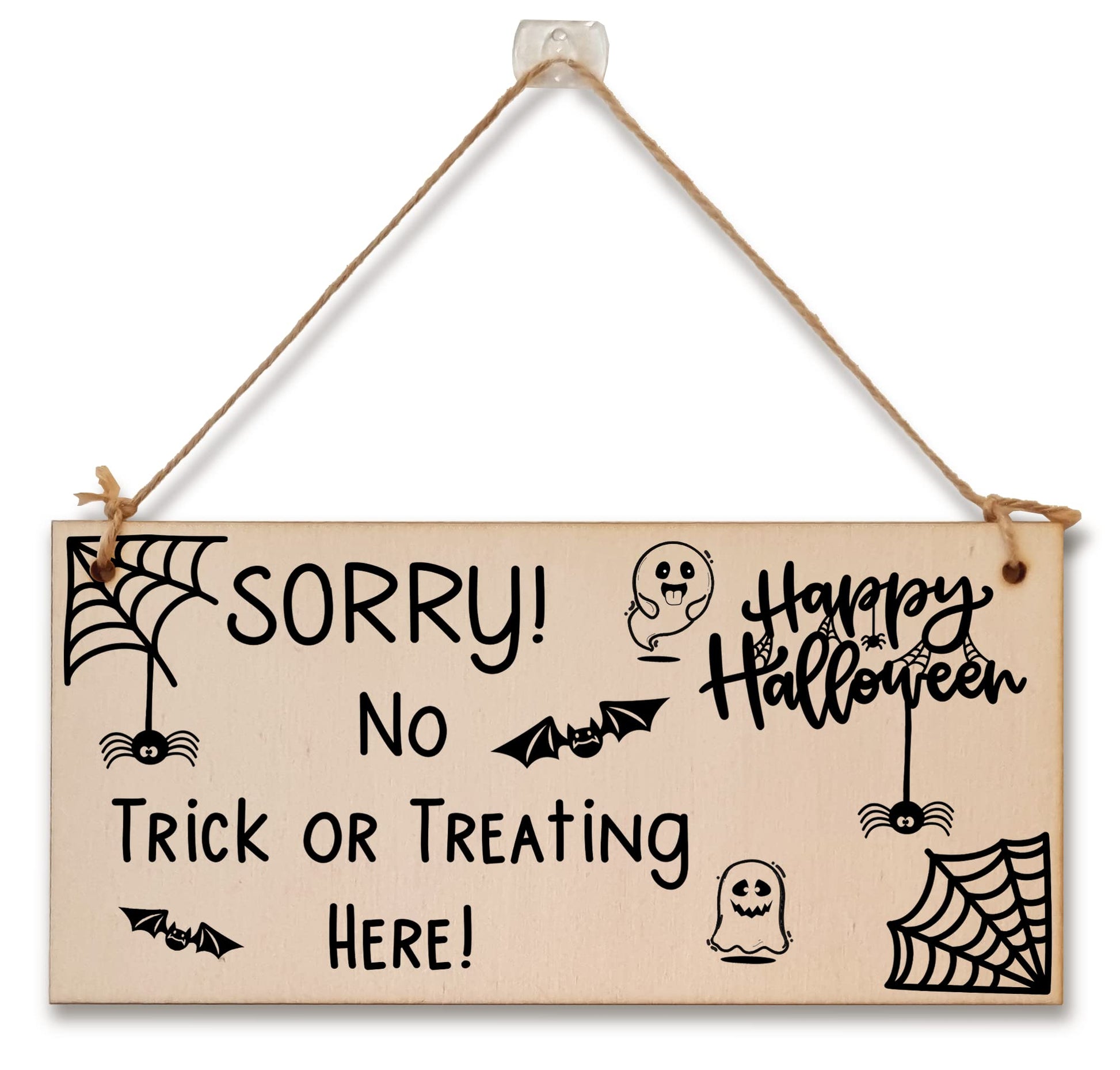 A beautifully designed, heart shaped plaque, handmade in the UK from sustainably sourced 3mm poplar wood. Size: 10 x 10 cm. Wording on hanging plaque: Sorry No Trick Or Treating Here Happy Halloween. Hang this sign in your window, or by your front door on Halloween night to tell all the trick or treaters that you don't want to be disturbed on the spookiest night of the year. Show that sweets can be taken but do n't knock or ring. A perfect, fun decorative sign to show that you just aren't into celebrating Halloween and to deter any little monsters from knocking on your front door. The plaque is made from high quality, sustainably sourced 6mm Plywood (PEFC Certified). The image is UV-printed in full colour, directly onto the wooden plaque, to ensure a high quality, bold and durable finish. It is packaged in a transparent sleeve, making it ideal to give as a gift, and comes with a small length of shabby, rustic hessian twine to hang up. This creative piece of wall art will add that little something extra to your space. From the kitchen to the living room, in the bathroom or the study, showcase your personality and hobbies in a fun and whimsical display. If not as a treat for you, then these are perfect to give as a gift to friends, family, neighbours, and colleagues. ***Please note, because these are made from untreated wood, the sign is designed for indoor use and should only be displayed outside for short periods during dry weather. Prolonged exposure to outdoor elements such as rain, water, frost, heat and UVs will damage and fade your sign.***