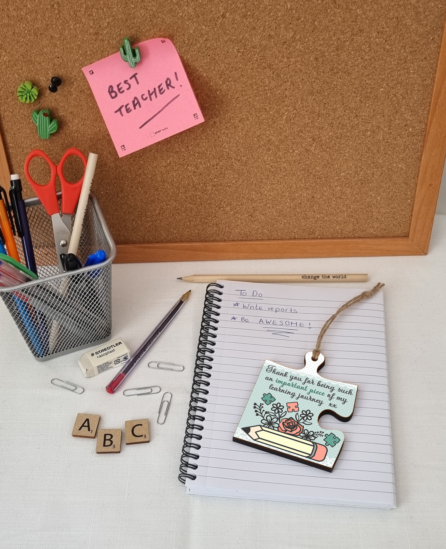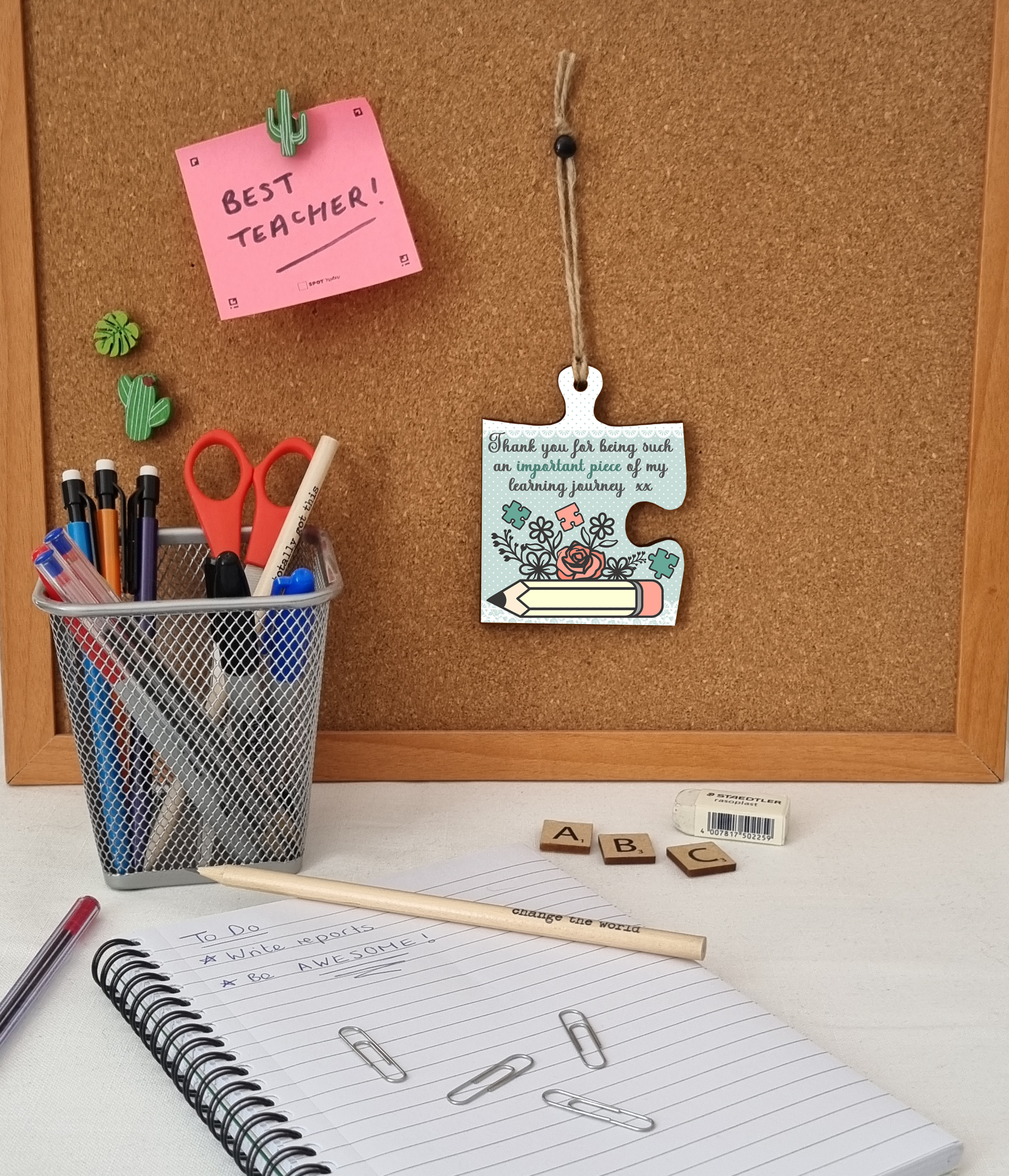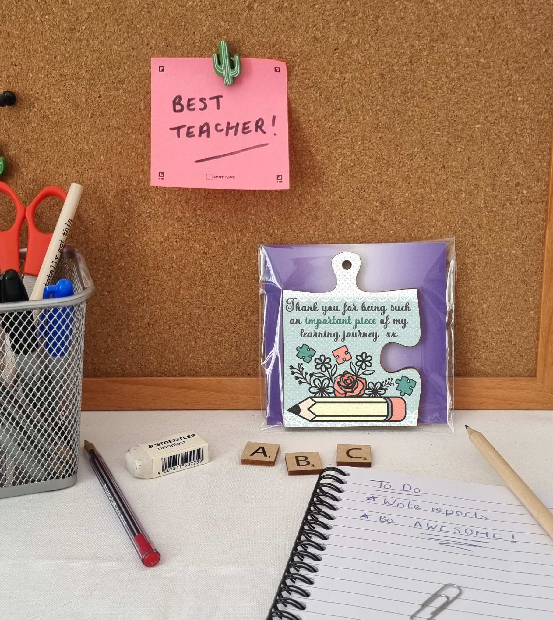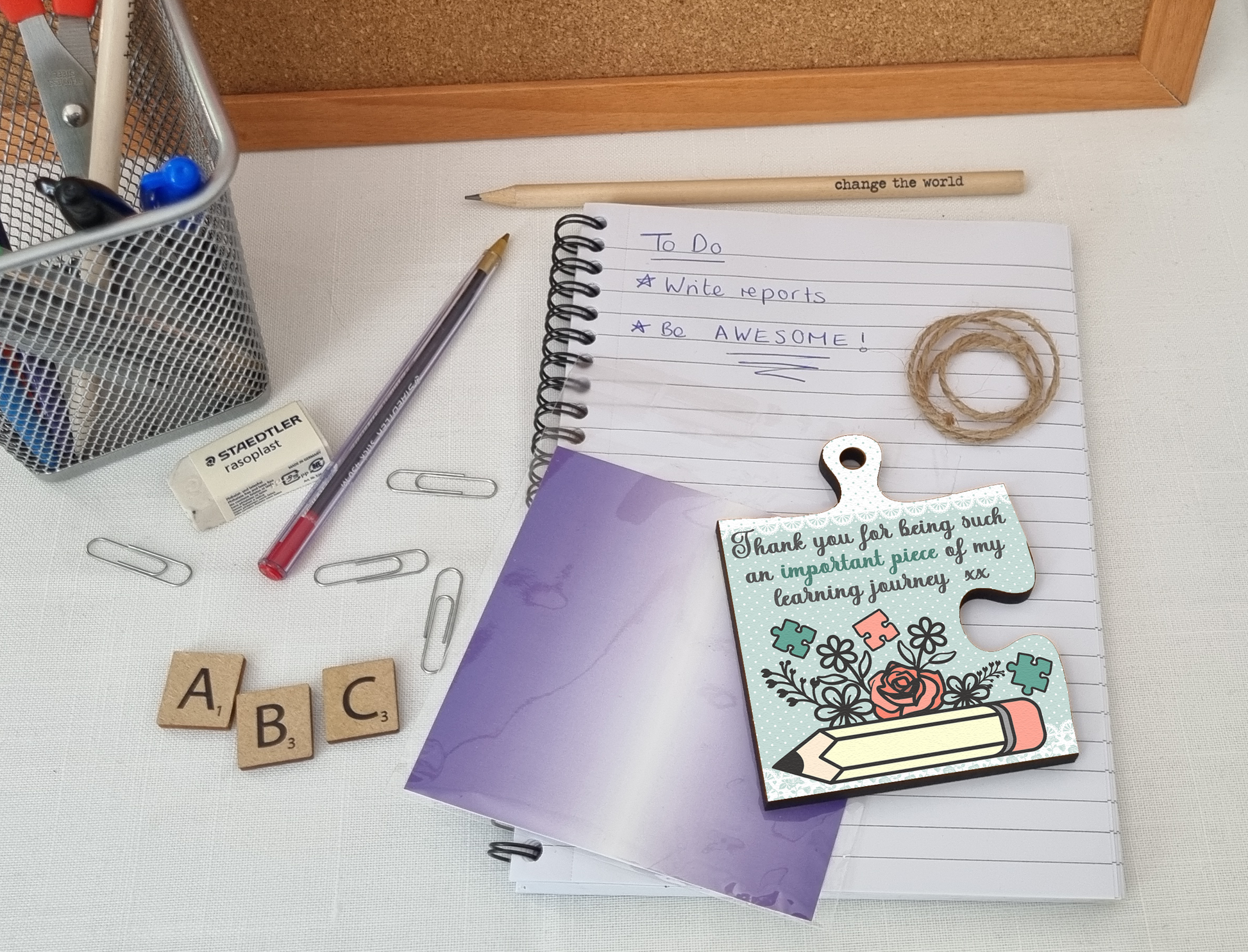 � {Perfect as a Gift} Every puzzle piece plaque is packaged in a simple transparent sleeve, ready to gift. A one-of-a-kind, card alternative that is easy send in the post. Every jigsaw piece includes a length of rustic hessian jute string for hanging. � {Fun Jigsaw Puzzle Shape} Thank you for being such an important "piece" of my learning journey" is a fun play on words for this jigsaw puzzle shaped decoration which expresses gratitude for the teacher's dedication, hard work, and impact. � {Materials & Size} Actual Size: 100mm (W) x 100mm (L). Shape: Jigsaw Puzzle Corner Piece. Made from durable 6mm MDF which feels sturdy and creates a smooth and vibrant printed finish. � {Handmade in the UK} The puzzle piece is handcrafted in Birmingham, UK, by a small team dedicated to creating high quality, affordable decorations. Every order is cut, printed and packaged with care and attention to ensure the product reaches you in perfect condition.A decorative hanging wooden jigsaw puzzle piece, which is perfect to give as a gift to someone special. Wording on the plaque: Thank you for being such an important piece of my learning journey xx. Show that AMAZING teacher or teaching assistant just how much of an impact they have had on your little one's learning throughout the year with this puzzle shaped card alternative that will stand out from all other standard end of term gifts. These make a perfect present for any educator, tutor, teaching assistant, nursery teacher or childminder. You know that your children have the best teacher so why not treat them to a gift that is perfect as a symbol of your appreciation and recognition for how special they are.The jigsaw puzzle piece is made from high quality and durable 6mm MDF. The image is UV-printed in full colour, directly onto the wooden plaque, to ensure a high quality, bold and durable finish. It is packaged in a transparent sleeve, making it ideal to give as a gift, or send as a card alternative directly to the recipient in the post. The puzzle shaped plaque comes with a small length of shabby, rustic hessian twine to hang up. Stand out from everyone with this unique and one of a kind gift for someone special. Customisation options are available making this deeply personal to the receiver. This is also a creative piece of wall art that will add that little something extra to your home. Showcase your personality and hobbies in a fun and whimsical display. ***Please note, because these are made from untreated wood, the sign is designed for indoor use and should only be displayed outside for short periods during dry weather. Prolonged exposure to outdoor elements such as rain, water, frost, heat and UVs will damage and fade your sign.***
