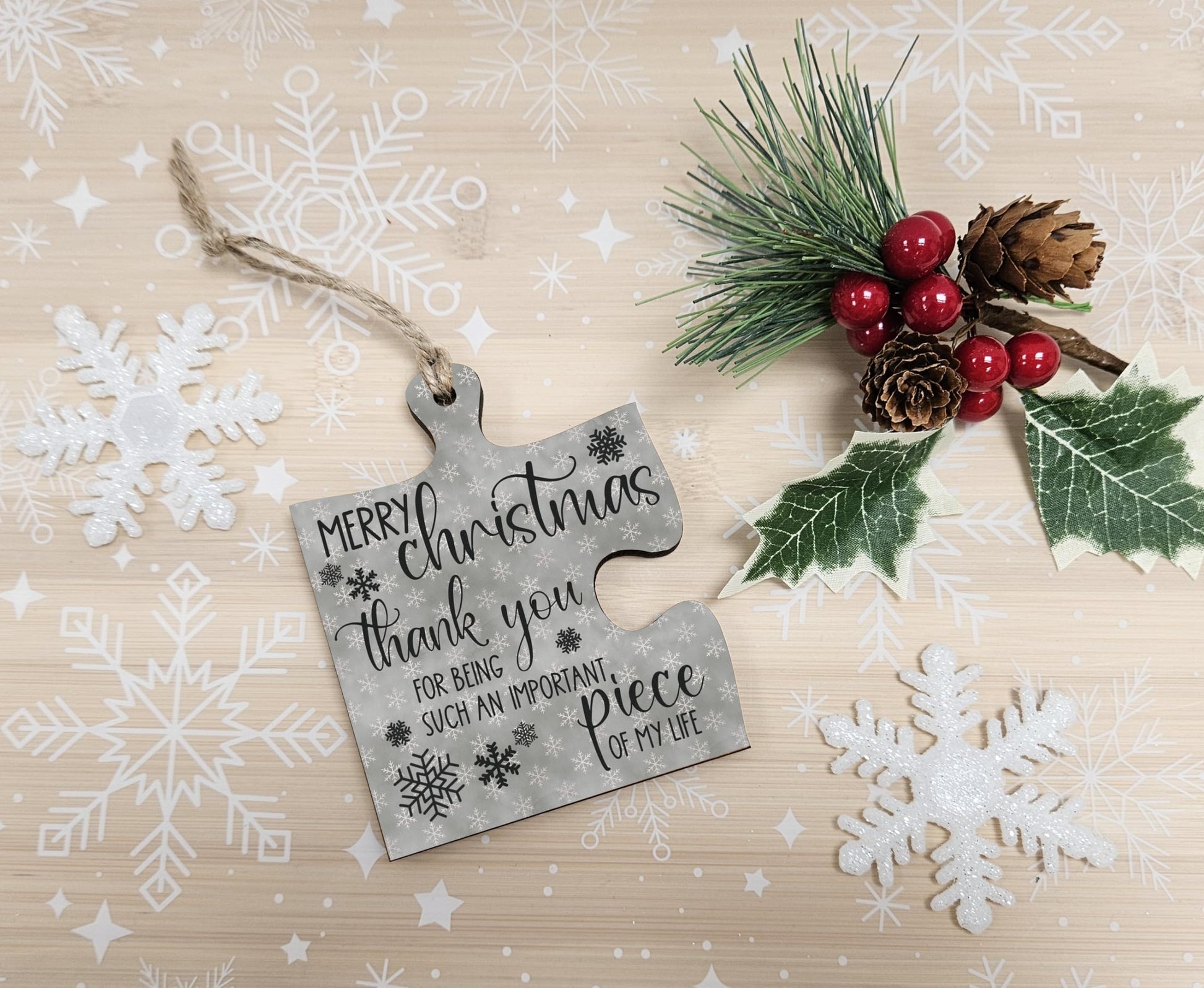 A decorative hanging wooden jigsaw puzzle piece, which is perfect to give as a gift to someone special. Wording on the plaque: Merry Christmas Thank you for being such an important piece of my life . Our versatile wooden jigsaw puzzle piece-shaped ornament, featuring a festive Christmas design and a customisable photo slot, is an xmas delight. Whether given as a heartfelt gift, hung on the Christmas tree as a bauble, or used as a special tag for presents, this charming piece adds a personal touch to all celebrations. Share the joy and warmth of the holiday season with this unique keepsake. The jigsaw puzzle piece is made from high quality and durable 6mm MDF. The image is UV-printed in full colour, directly onto the wooden plaque, to ensure a high quality, bold and durable finish. It is packaged in a transparent sleeve, making it ideal to give as a gift, or send as a card alternative directly to the recipient in the post. The puzzle shaped plaque comes with a small length of shabby, rustic hessian twine to hang up. Stand out from everyone with this unique and one of a kind gift for someone special. Customisation options are available making this deeply personal to the receiver. This is also a creative piece of wall art that will add that little something extra to your home. The puzzle piece tag would look beautiful hung on the Christmas tree to remember that special someone. Showcase your personality and hobbies in a fun and whimsical display. ***Please note, because these are made from untreated wood, the sign is designed for indoor use and should only be displayed outside for short periods during dry weather. Prolonged exposure to outdoor elements such as rain, water, frost, heat and UVs will damage and fade your sign.***