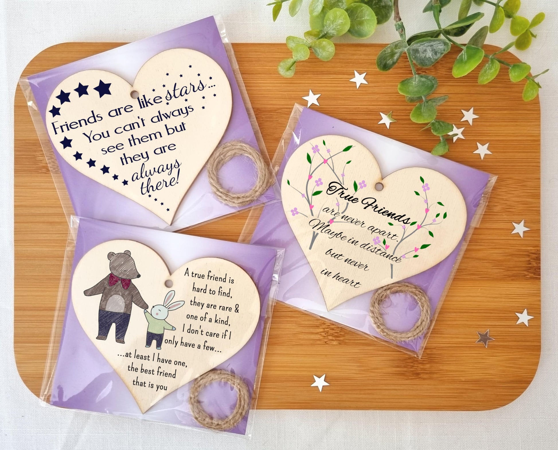 Celebrate the timeless beauty of friendship with our trio of heart-shaped hanging plaques, each thoughtfully crafted in the UK and inspired by the profound bonds shared between true friends. Crafted from 3mm FSC certified sustainable ply, these delightful pieces are not just a nod to enduring relationships, but also to environmental consciousness and sustainable living. Each plaque within the set showcases a distinct and unique design, ensuring that the collective set embodies diverse expressions of friendship, making them apt for various occasions or individual gifting. Whether it's a heartfelt message, an intricate pattern, or an evocative image, every detail is meticulously created to evoke warmth and appreciation. Position them in your cherished spaces to daily remind you of the love shared with friends, or gift them to your beloved pals as a tangible symbol of your unspoken bond. Ideal for birthdays, friendship anniversaries, or simply just because, these plaques are a sublime way to express appreciation, love, and everlasting friendship to those who mean the world to you. Not to forget, by choosing this product, you are also contributing to sustainable practices that protect our planet, echoing the harmony of cherishing relationships while caring for our Earth. Discover the wonder, experience the quality, and share the love with these heartwarming plaques, uniting friends and sustainable practices under one affectionate gesture. Together, let’s weave tales of friendship and sustainability, one heartfelt gift at a time. - Heart 1 reads - Friends are like stars. You can't always see them, but they are always there… - Heart 2 reads - A true friend is hard to find, they are rare & one of a kind, I don't care if I only have a few. at least I have one, the best friend that is you. - Heart 3 reads - True friends are never apart. Maybe in distance but never in heart.