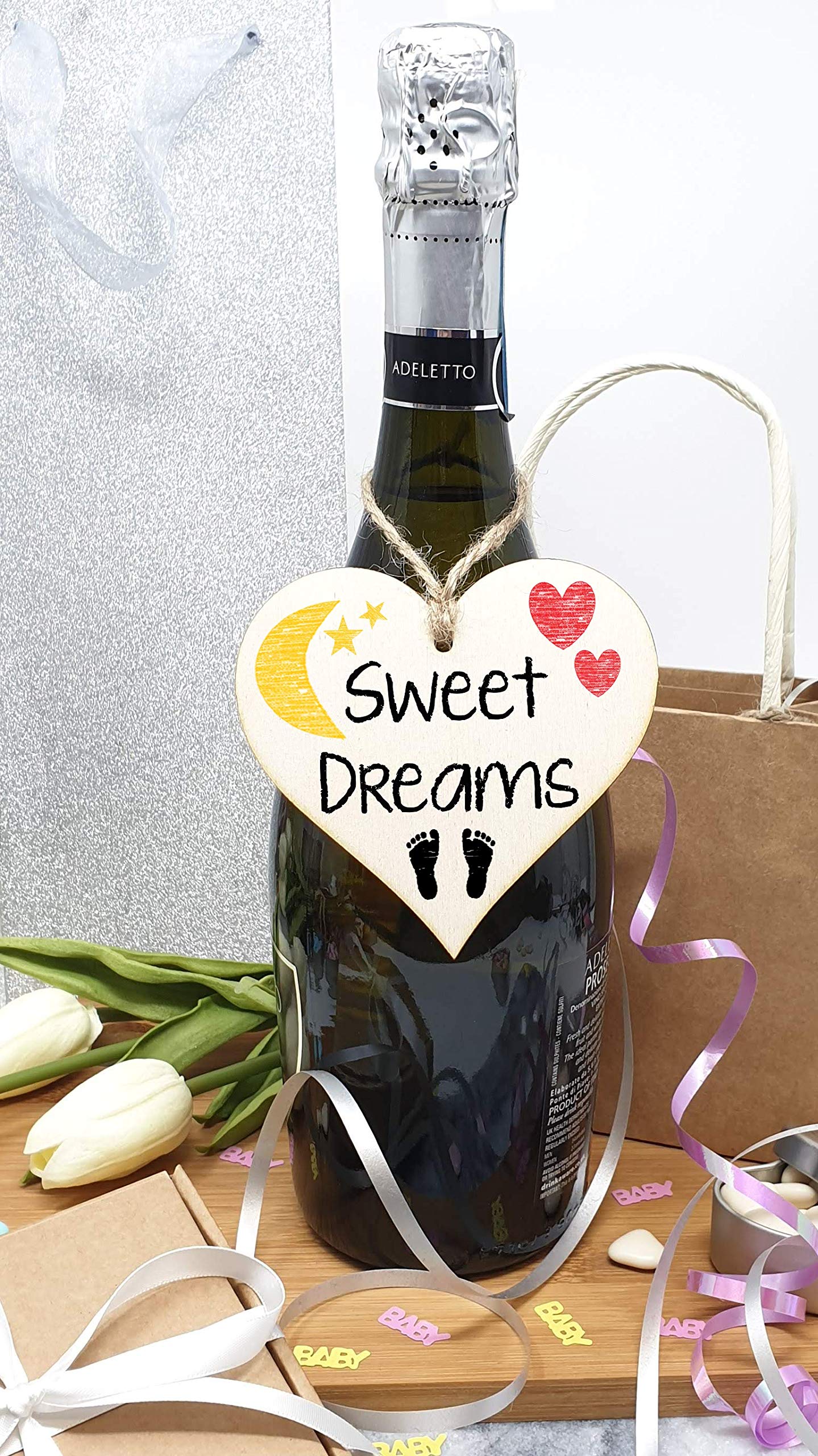 Wording on plaque decoration: Sweet Dreams These beautiful, handcrafted, heart shaped wooden plaques make a great little gift to commemorate the arrival of a new baby. They make an ideal present for new parents, or grandparents. The shabby chic wooden effect is perfectly on trend but also timeless in style. The simple crayon style design is perfect to decorate a nursery or little child's bedroom. The plaque is packaged in a transparent sleeve making it ideal to present in a card, or even to use as an alternative to a traditional greetings card. These also look perfect used as a tag on a gift bag. Or why not wrap around the neck of a celebratory bottle of champagne to toast the new arrival in the family.