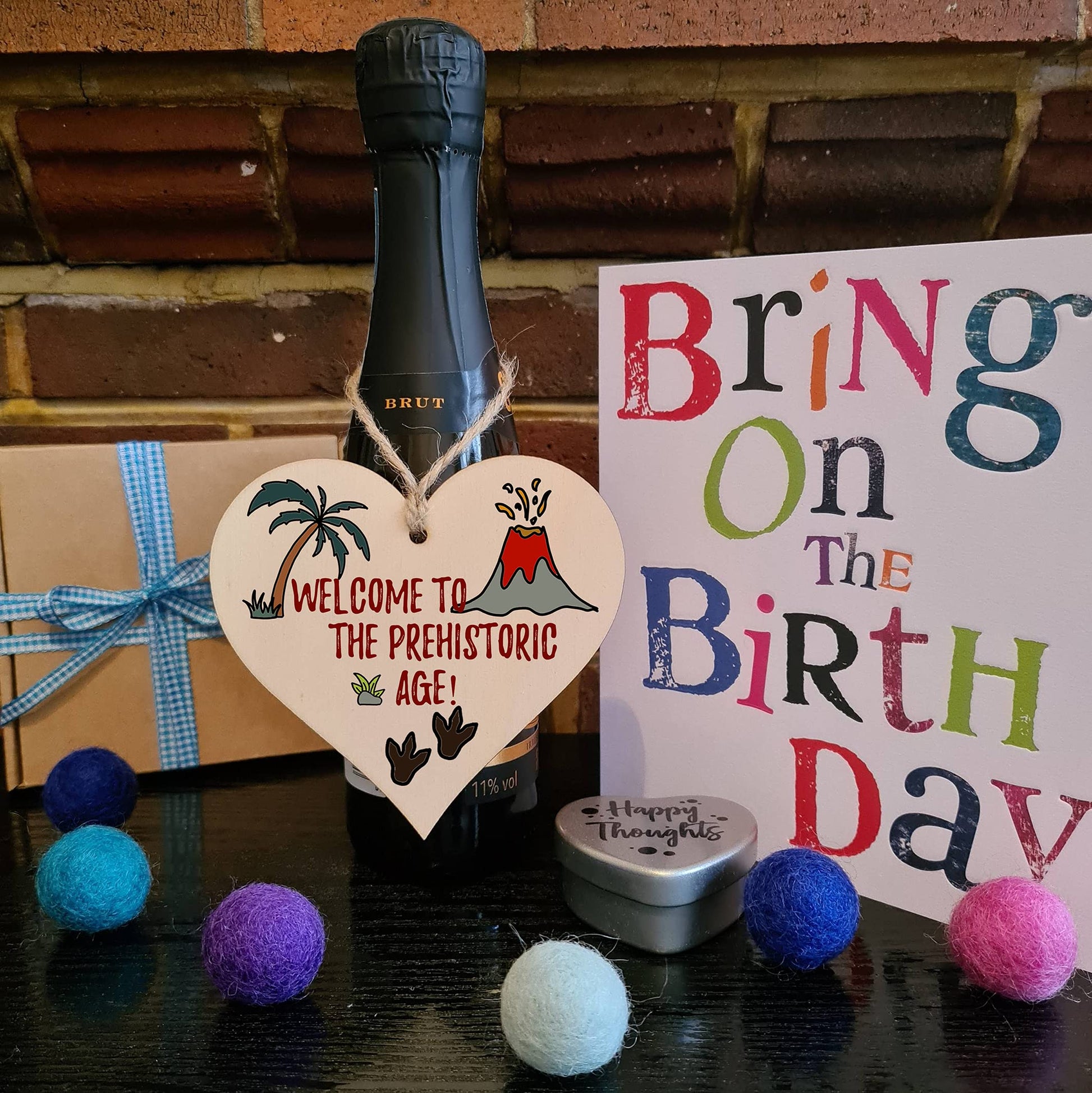 A beautifully designed, heart shaped plaque, handmade in the UK from sustainably sourced 3mm poplar wood. Size: 10 x 10 cm. Wording on hanging plaque: Welcome to the prehistoric age The design is totally unique and the print is applied directly onto the heart making it extremely vibrant and durable. All design, manufacture and packaging is done by a small team based in the UK. The heart is packaged in a transparent sleeve, and comes with a length of shabby chic twine, making it perfect to give as a gift. Ideal for use as tags on presents and gift bags, or you could hang it around the neck of a bottle. These are an ideal alternative to a traditional greetings card. The fun design and wording are just perfect to send Birthday Wishes to friends in a novelty and unique way. This hanging heart is great as a 'just because' gift for someone special, be it friends, family, neighbours, colleagues or grandparents. Maybe even as a little treat for yourself.